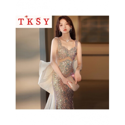 TKSY鱼尾晚礼服裙2024新款高端轻奢小众法式感敬酒服新娘婚纱女冬 香槟金色+蝴蝶结 XS