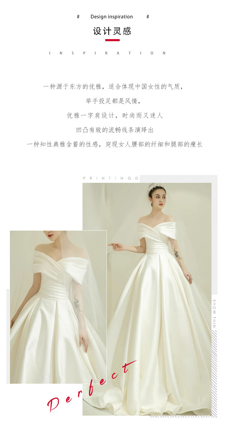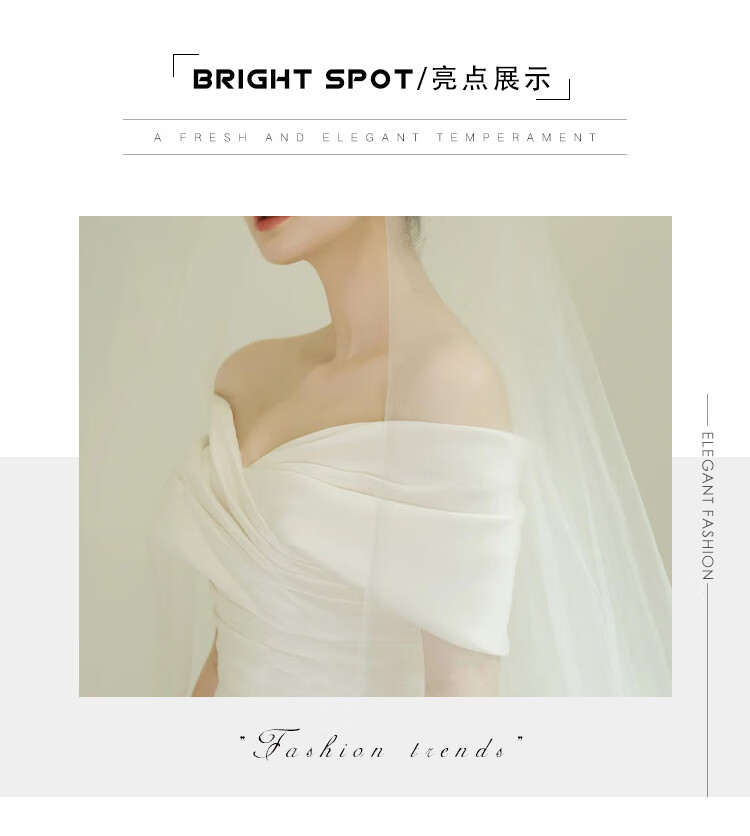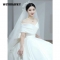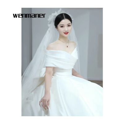 商品名称:蕰蔓唲婚纱新娘主纱2024小个子一字肩缎面新款拖尾法式轻出门纱冬季 米白齐地 三件装 XXL