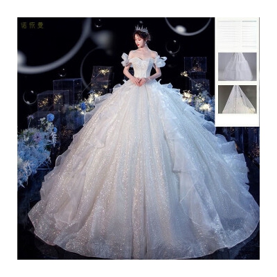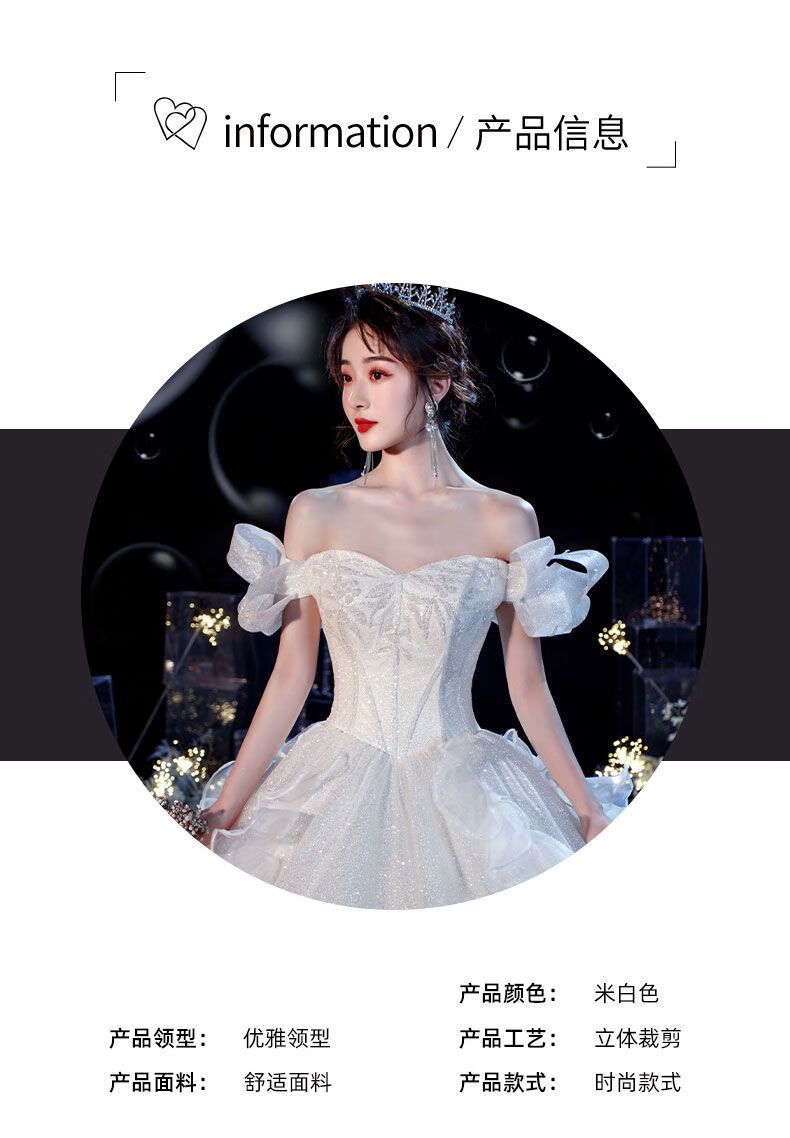 商品名称:STiannn_shim高级质感法式主婚纱2024新款一字肩气质新娘宫廷风高端蕾丝大拖尾 白色齐地 L
