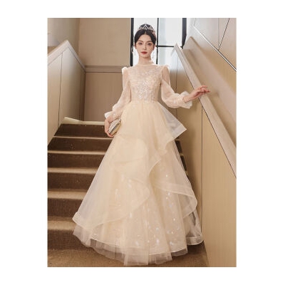 PZCL婚纱新娘主纱2024香槟色晚礼服裙女2024端宴会主持人生日艺考成人 香槟色 M
